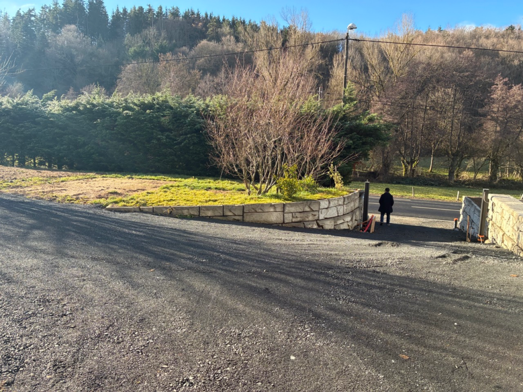 Le chantier réalisé par Bonnefoy TP consistait à créer un mur avec arrondis et redans, séparant deux maisons individuelles et intégrant deux entrées de portails devant la route. Le projet impliquait également l’aménagement de l’entrée de cour, rendant le chantier complexe en termes d’accès et de précision.